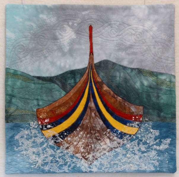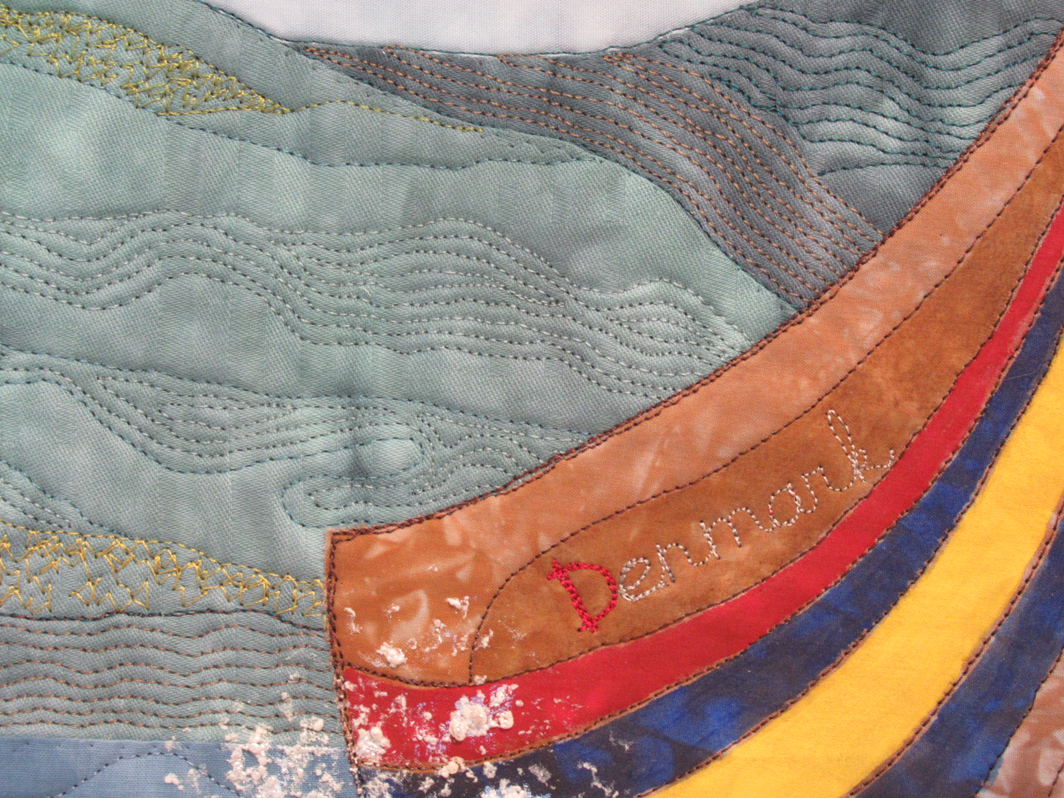Very effective design of the boat splashing through the water and the mountains in the background. I love the way that your quilting emphasises the contours of the land and incorporates the traditional design in the sky. The techniques you have used for the water are perfect.