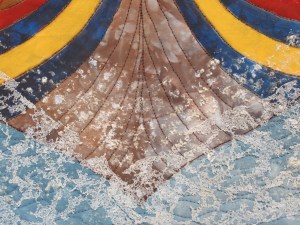 I also wanted to bring a celtic note to my piece. I reproduced a design taken from a colouring book belonging to my children quite a long time ago … but I had to redraw it as it was a frame around a page and I wanted it curved. It took me a long time but I liked the result and machine quilted it on the sky like a rainbow. I added echo quilting by hand. The boat is fused on the top after all the quilting on the landscape is done, then it is quilted and painted.