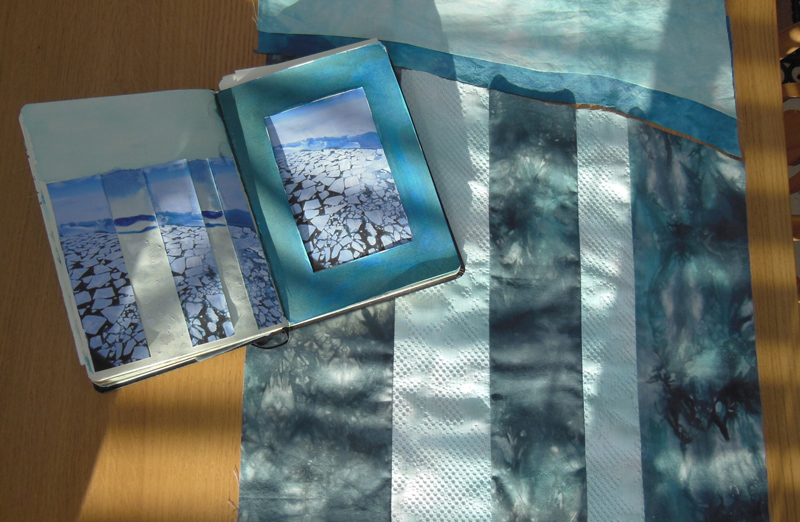 On the dark fabric the Pancake ice shapes are fused and appliquéd with a free-motion ziz-zag stitch. The white fabric is textured to suggest thickness. On the white stripes the Pancake ice shapes are suggested with iridescent paint, inktense pencil and free motion quilted. The tarlatane illustrates the foam, the beads are like small ice cubes. French knots to illustrate foam when the Pancake ice shapes are bumping into each other. The quilt is faced.