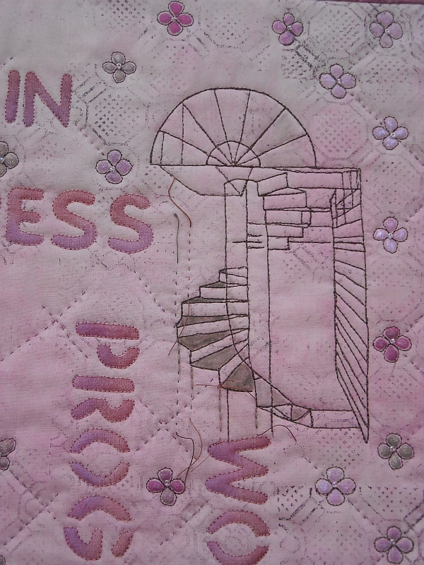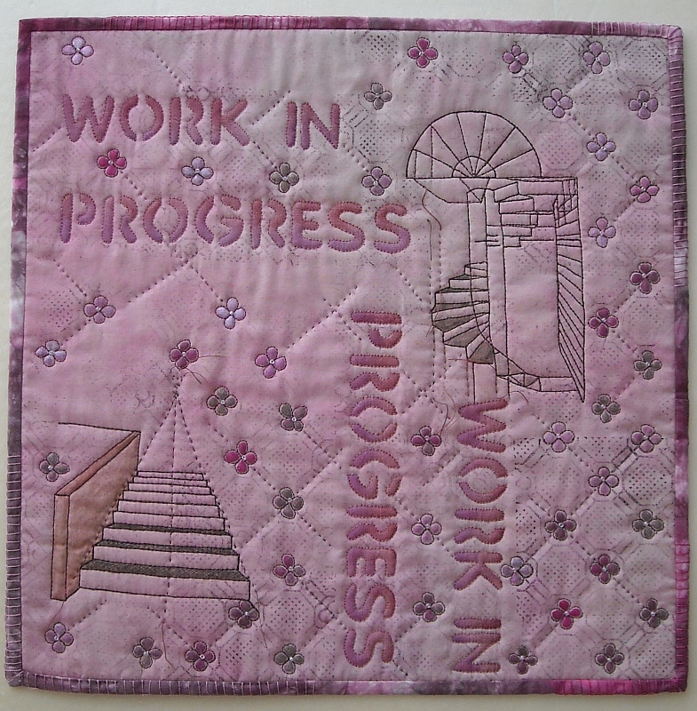 For me progress or progression represents something we tend to reach, something unfinished. That is why the printing on the background is incomplete and the quilting unfinished. For the same reason the embroideries on the biais are unfinished.