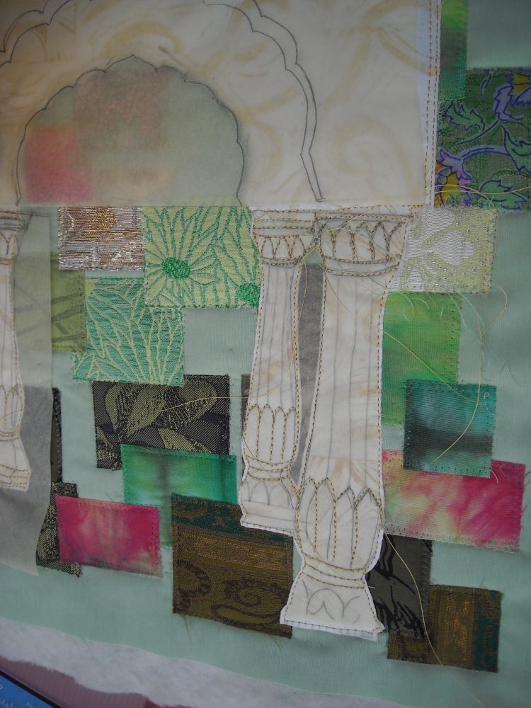 The Arch is fused on the top, and made with white satin printed with a lino block and gold paint.