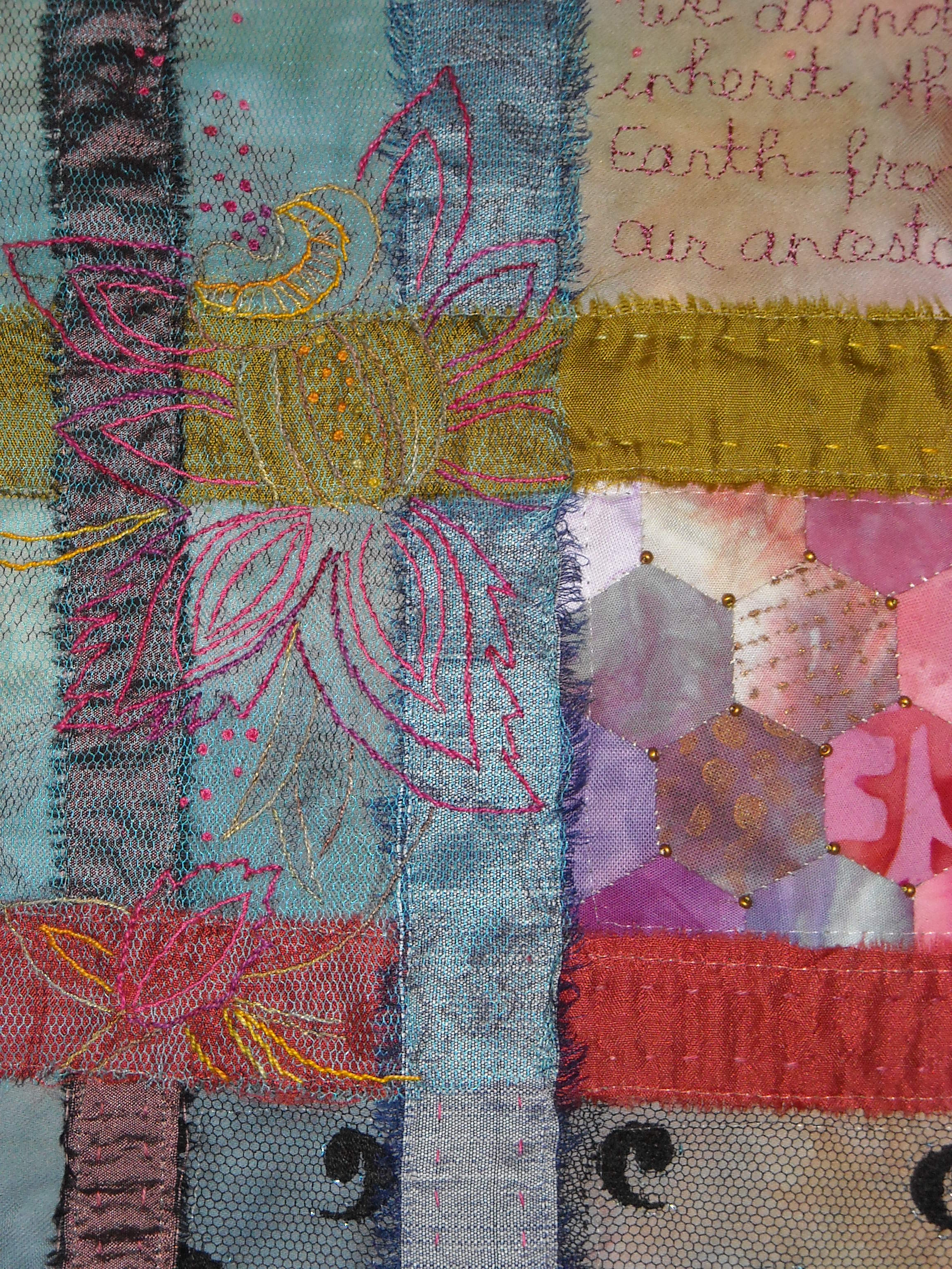 Free motion quilting for the quotation. Hand embroideries on a silk printed tulle and hand quilting.