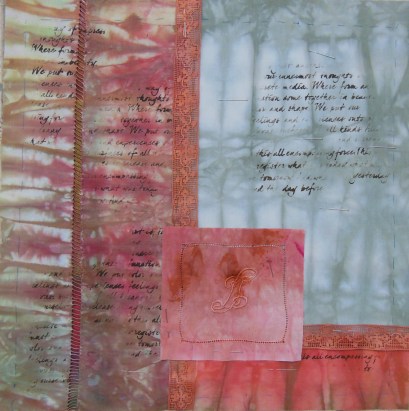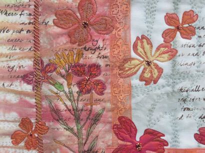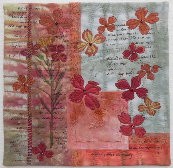Technique : I started by layering and sewing my fabric in place and didΒ the stencilling. This time I did not fuse them because I wanted to do more handstitching and I wanted the quilt to stay soft. The different fabrics are linked with the lace and the monogram piece is appliqued with a tiny buttonhole stitch. The flowers are cut out from silk and embellished with metallic paint. They are fused on the background and free motion quilted. They are floating in the air, movingΒ in the wind …