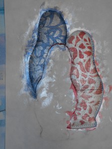 Background : I sprayed my fabrics with water, crumpled and painted them with setacolour fabric paint. I wanted to re-create a cold and icy atmosphere.  For the top I used one of my photos taken at Moscow Kremlin. It is free motion quilted and painted with inktense blocks and Jaquart Lumière fabric paint. The Matriochkas represent the idea of meeting new people. They are stencilled, using masks for each step.