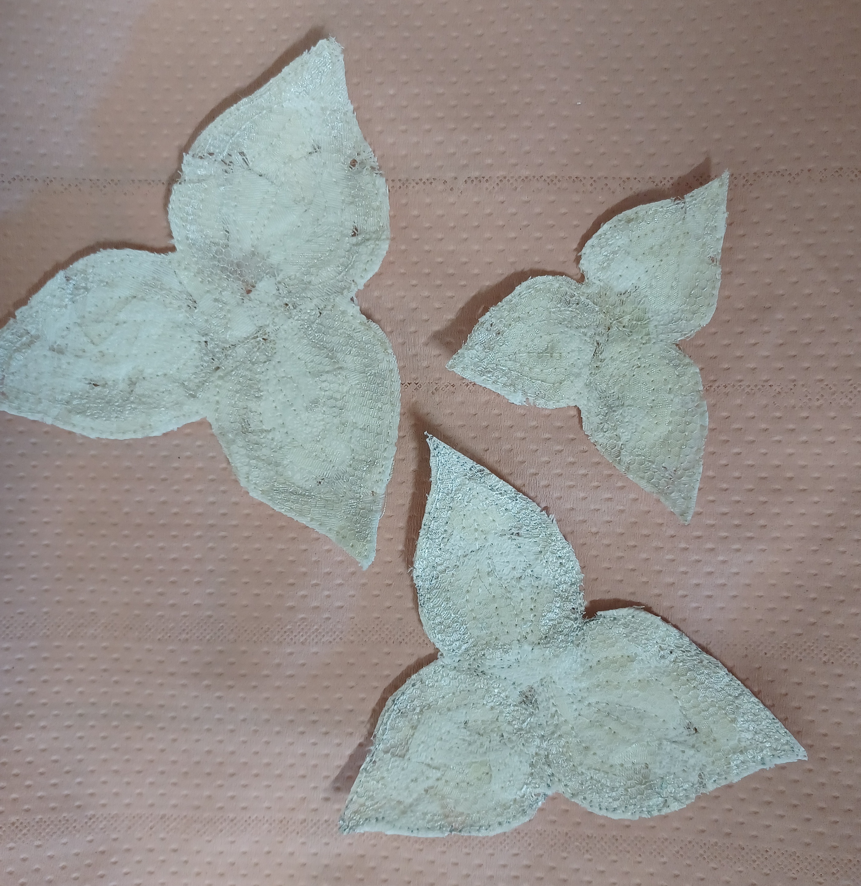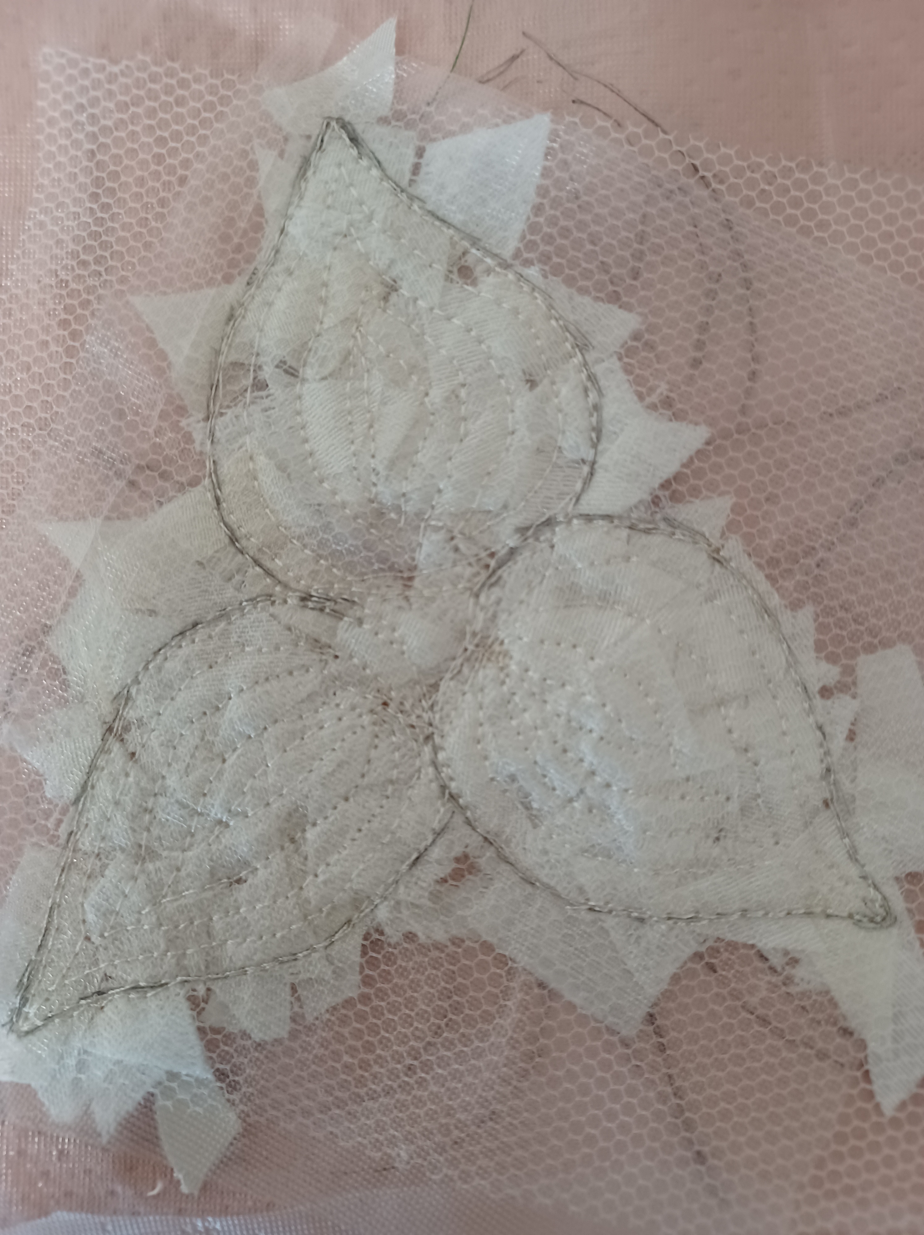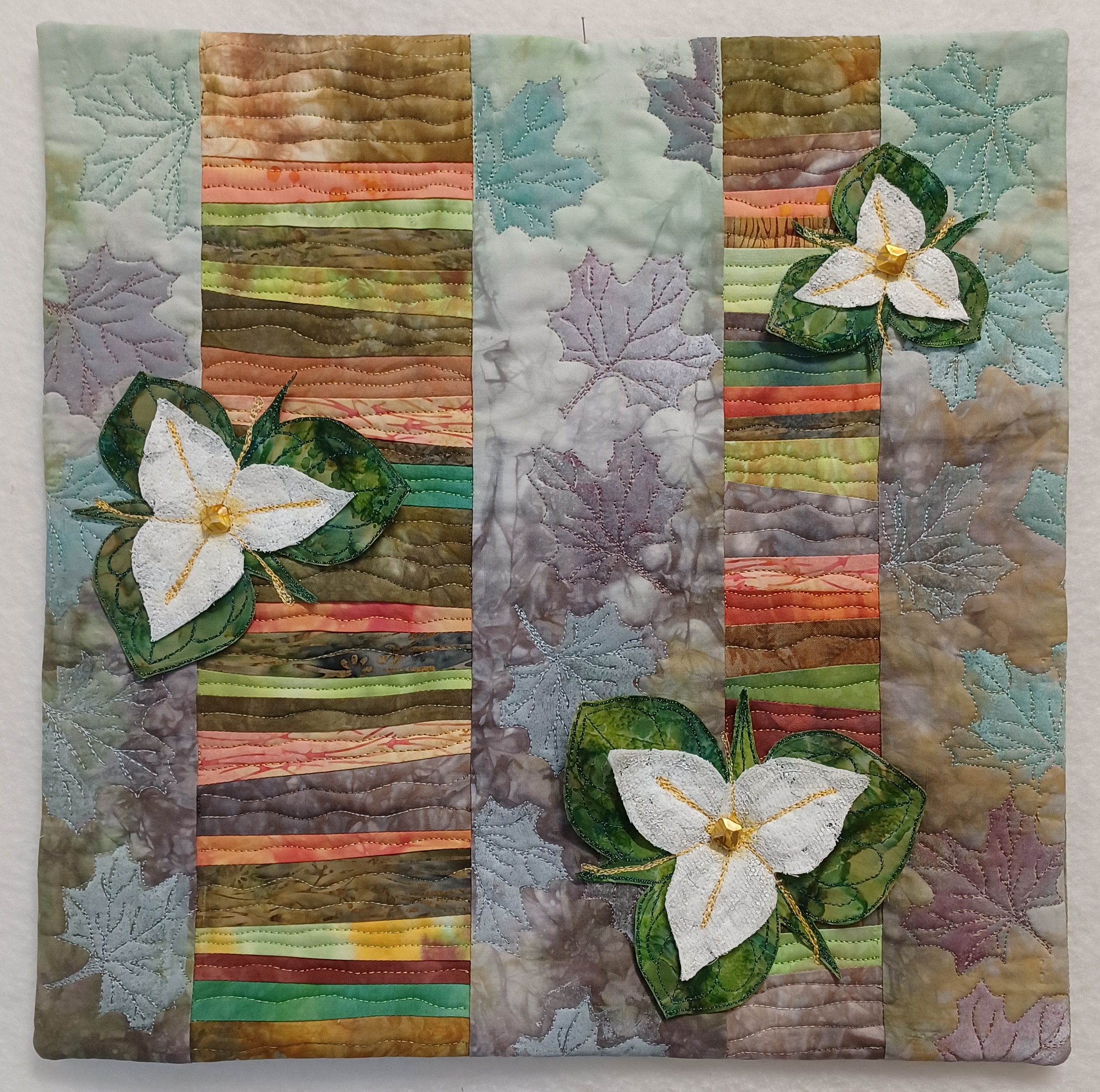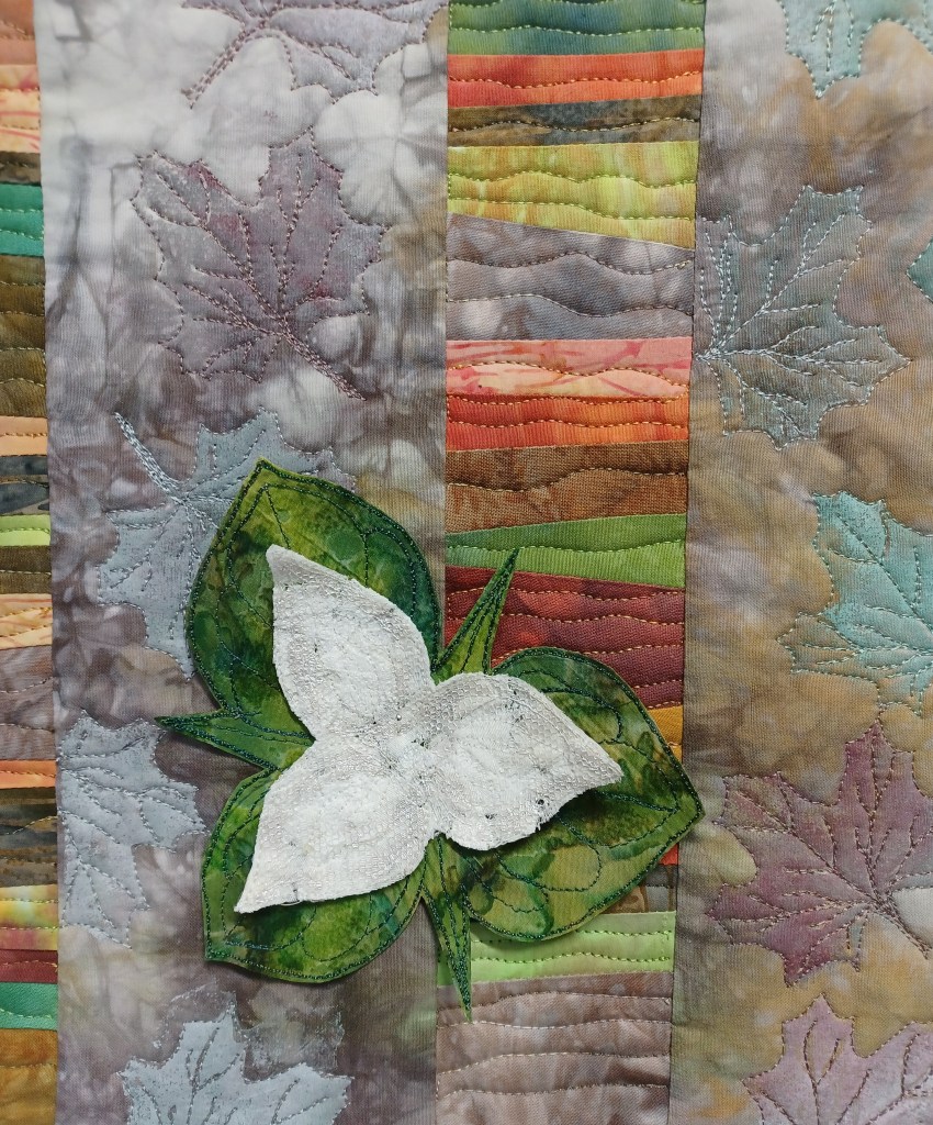 For the trillium flowers I used a drawing found in a children’s colouring book which I reproduced on a piece of water-soluble film. I prepared a “sandwich” with small pieces of different white fabrics between two layers of water-soluble film, they were heavily quilted and cut out. For the leaves I fused two layers of fabric, quilted the leaves and veins and cut them out.