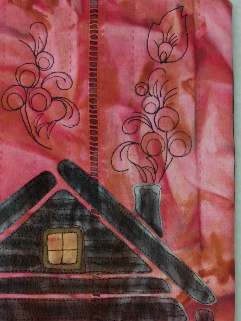 The isba is fused onto the background so that the background fabric can be seen between the different pieces to accentuate the colour contrast. The brown fabric used for the isba is hand dyed but has been repainted with inktense blocks to simulate the black beams.