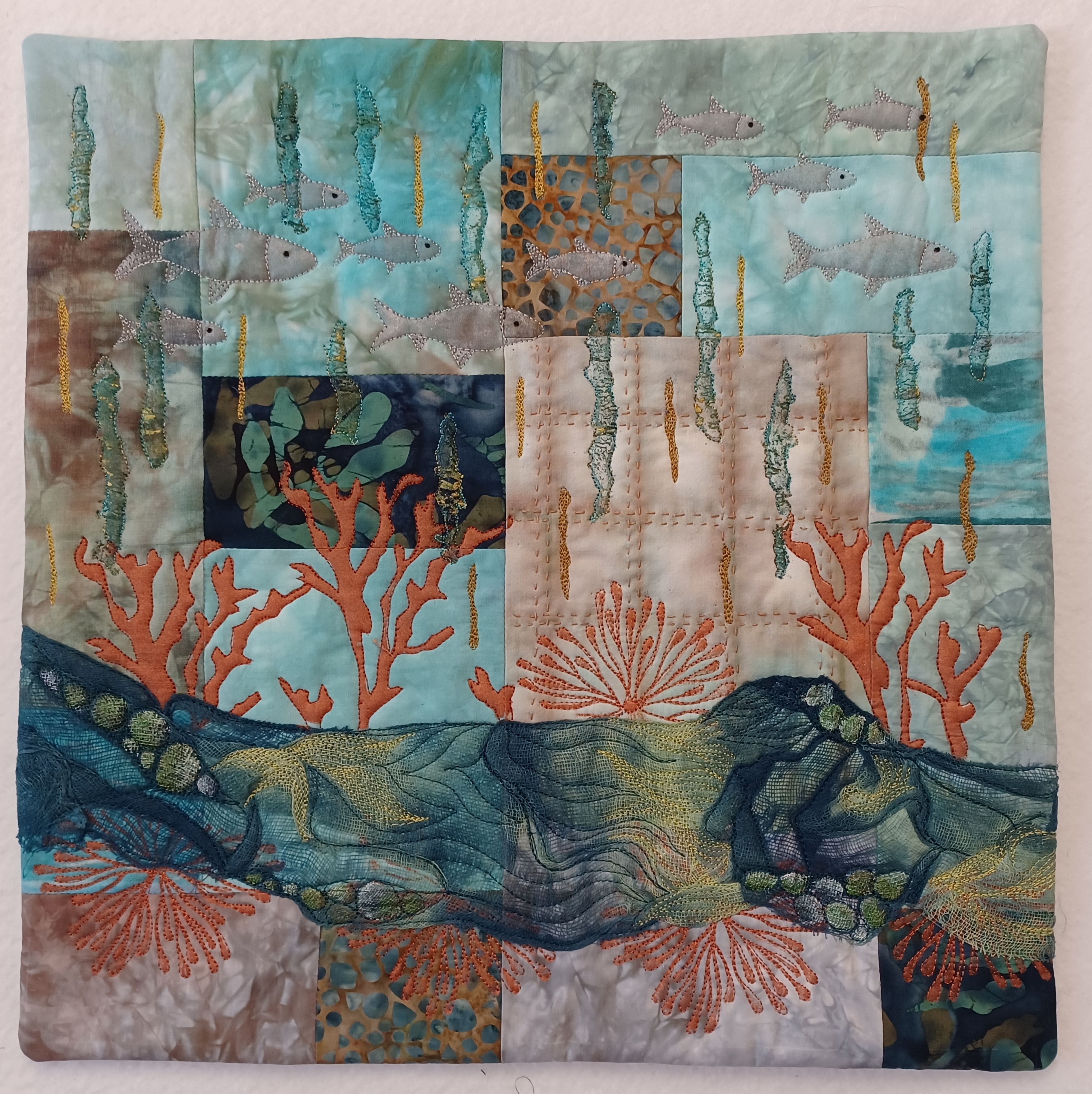 What a beautiful underwater world you have created. Wonderful composition with the perfect fabric choices and stitching. Well done!