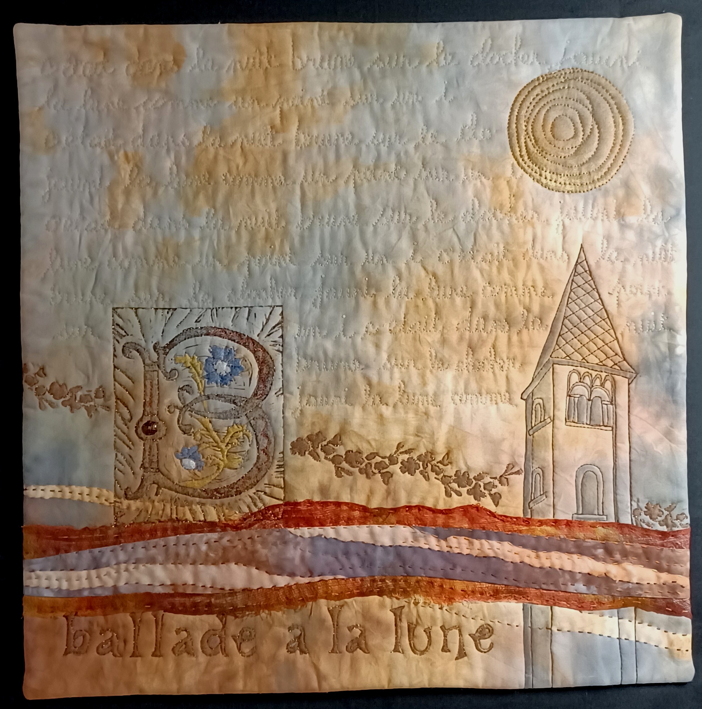How lovely to use poetry as your theme. I especially love the continuous stitching of the text, provides such beautiful texture. Very delicate letter B and lettering of the name. The colors of the French flag leave no doubt as to the origin of the text. Wonderful quilt.