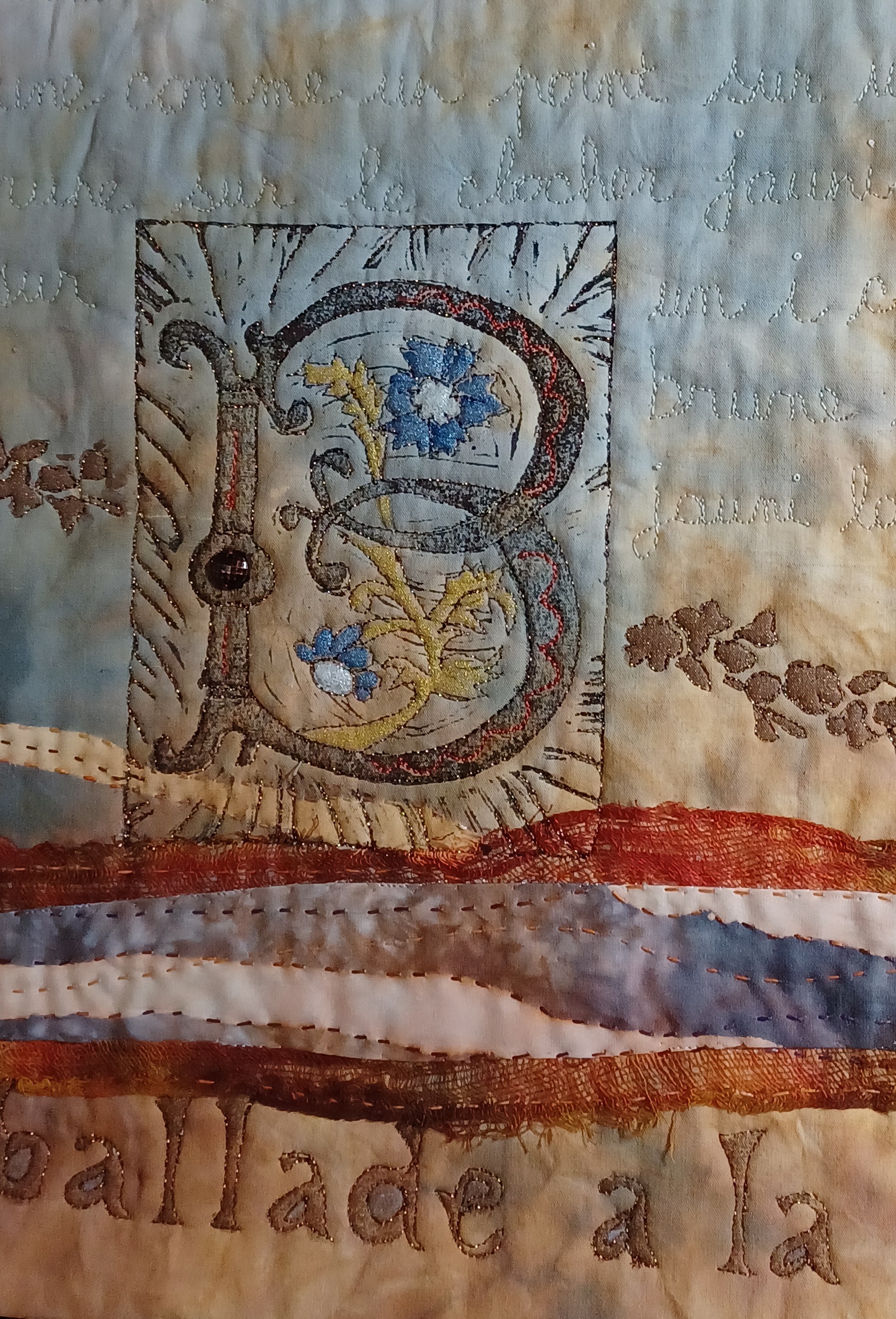 7. How lovely to use poetry as your theme. I especially love the continuous stitching of the text, provides such beautiful texture. Very delicate letter B and lettering of the name. The colors of the French flag leave no doubt as to the origin of the text. Wonderful quilt.