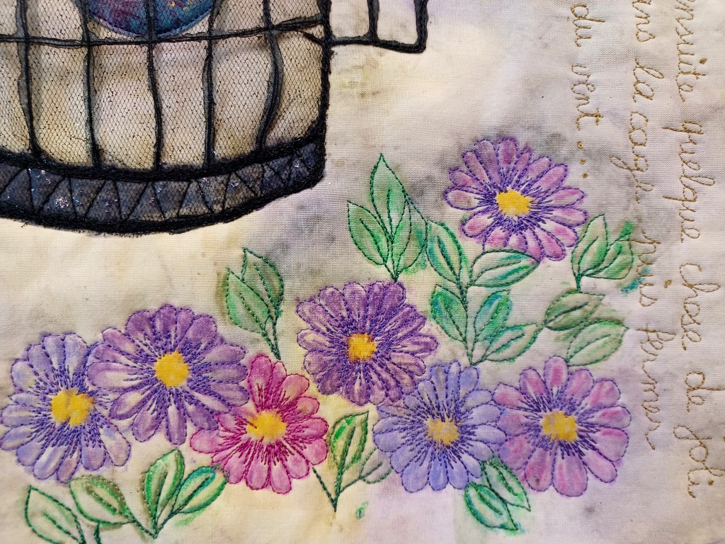 The background fabric is painted with diluted acrylics. The flowers were drawn on a serigraphy screen with neocolors II, then transferred with gel medium on the fabric and worked in free-motion quilting.