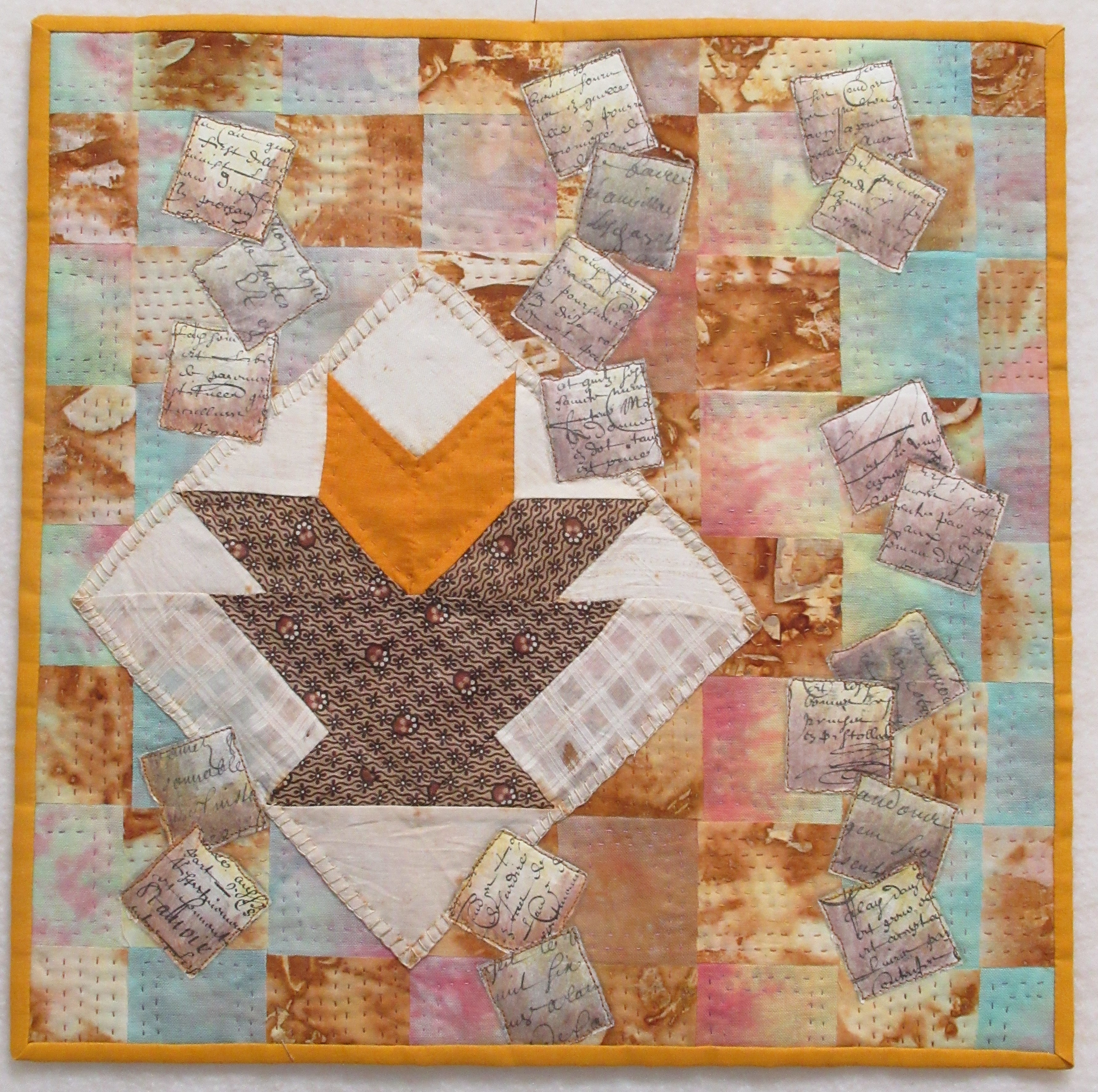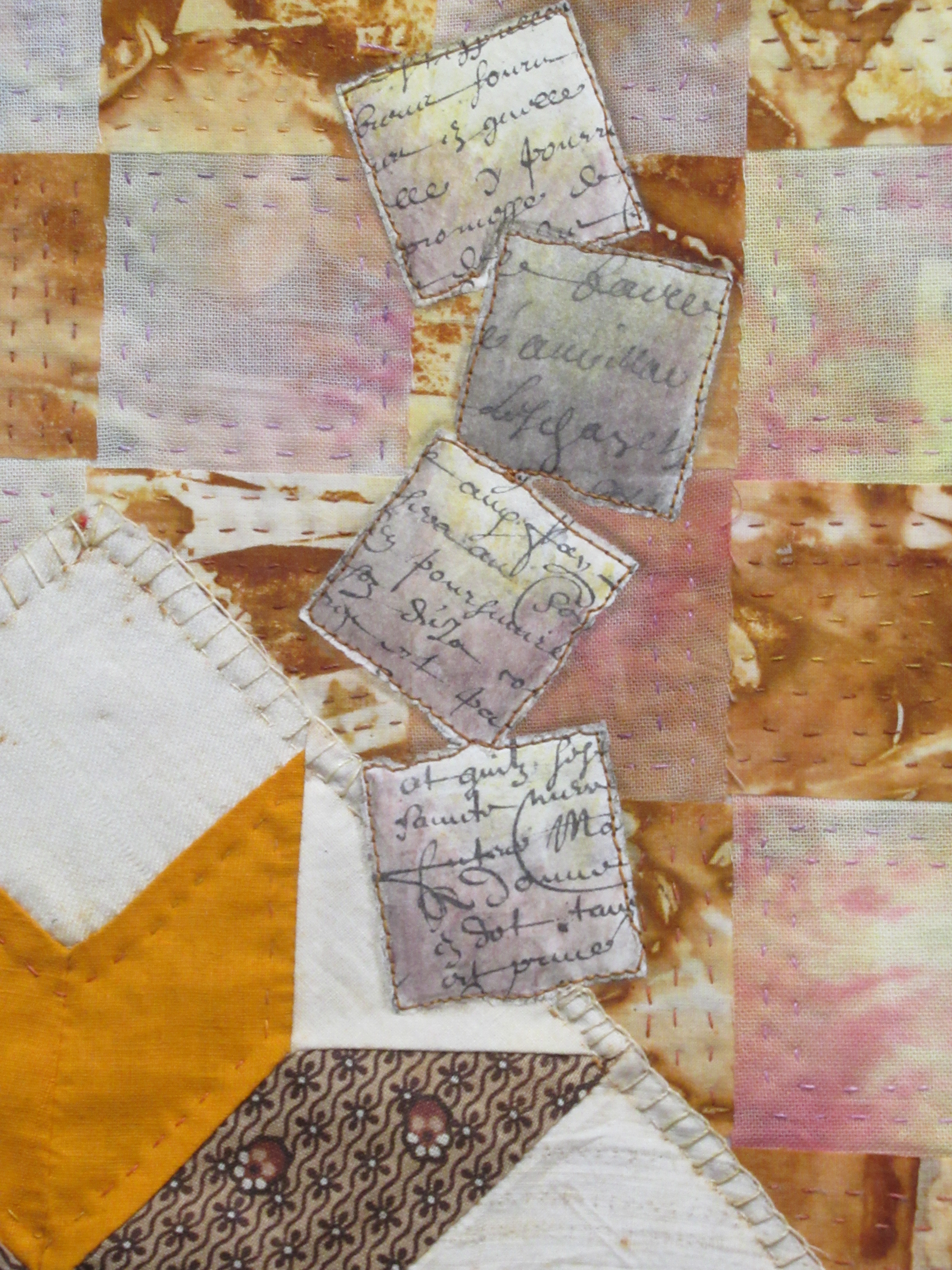 The colors you used are beautiful as ever. Good composition and the part of paper makes this quilt very special.