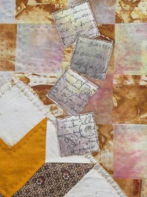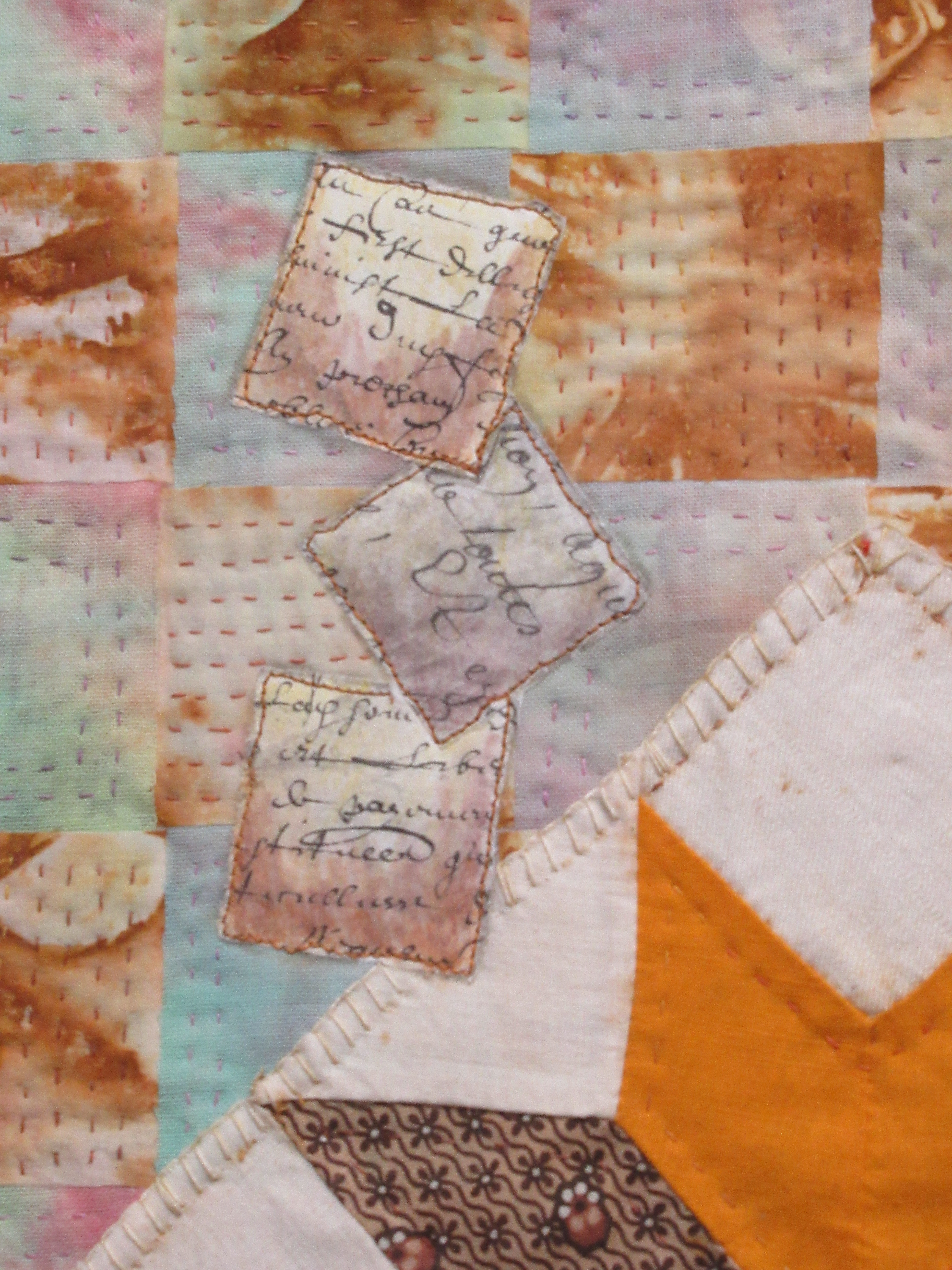 Stripes from two different fabrics are woven together : they represent the alliances among families. The stripes are fused on the batting. One fabric is rusted, the other one is hand dyed : they represent past and present. A vintage block is appliquéd on the top : it is the impact of the past in our lives, our memories. Bits of shredded paper (family documents) are spread over the background and represent the fragility of our destiny. They are aged with inktense pencils and waxed.