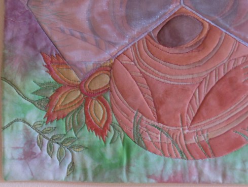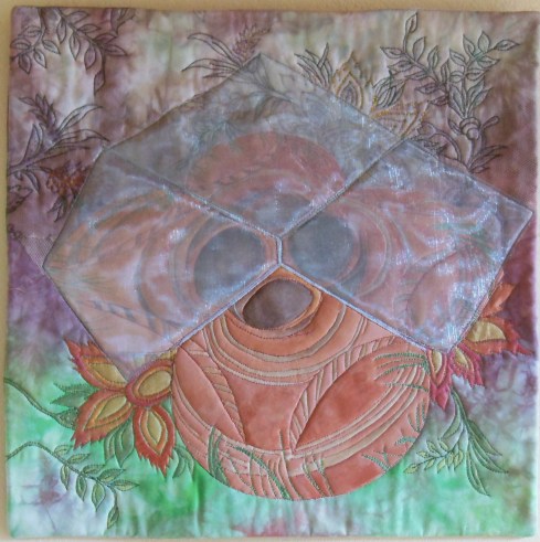 An interesting approach and as usual it is well carried out and stitched. I particularly like how the organza gives the ‘reflections’ in the glass, and the subtle use of foliage in the layers.