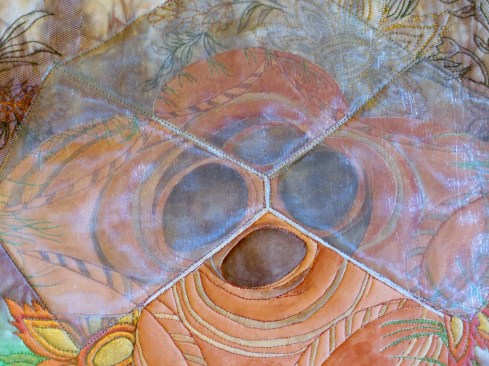 Material : hand-dyed fabric, tulle, organza, ochres, metallic paint (Jaquart Lumière), rayon thread.