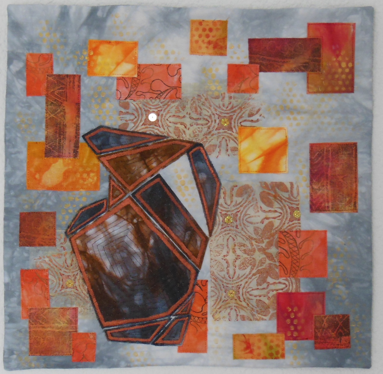 I love the way how you “translated” the background of your first piece into this one. Very nice composition. The cubist version of the pottery is very well done. I like the quilting in it.