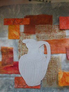 This has worked really well, I especially like the way that you have constructed the jug and defined the shapes with stitching. Lovely colour combination.