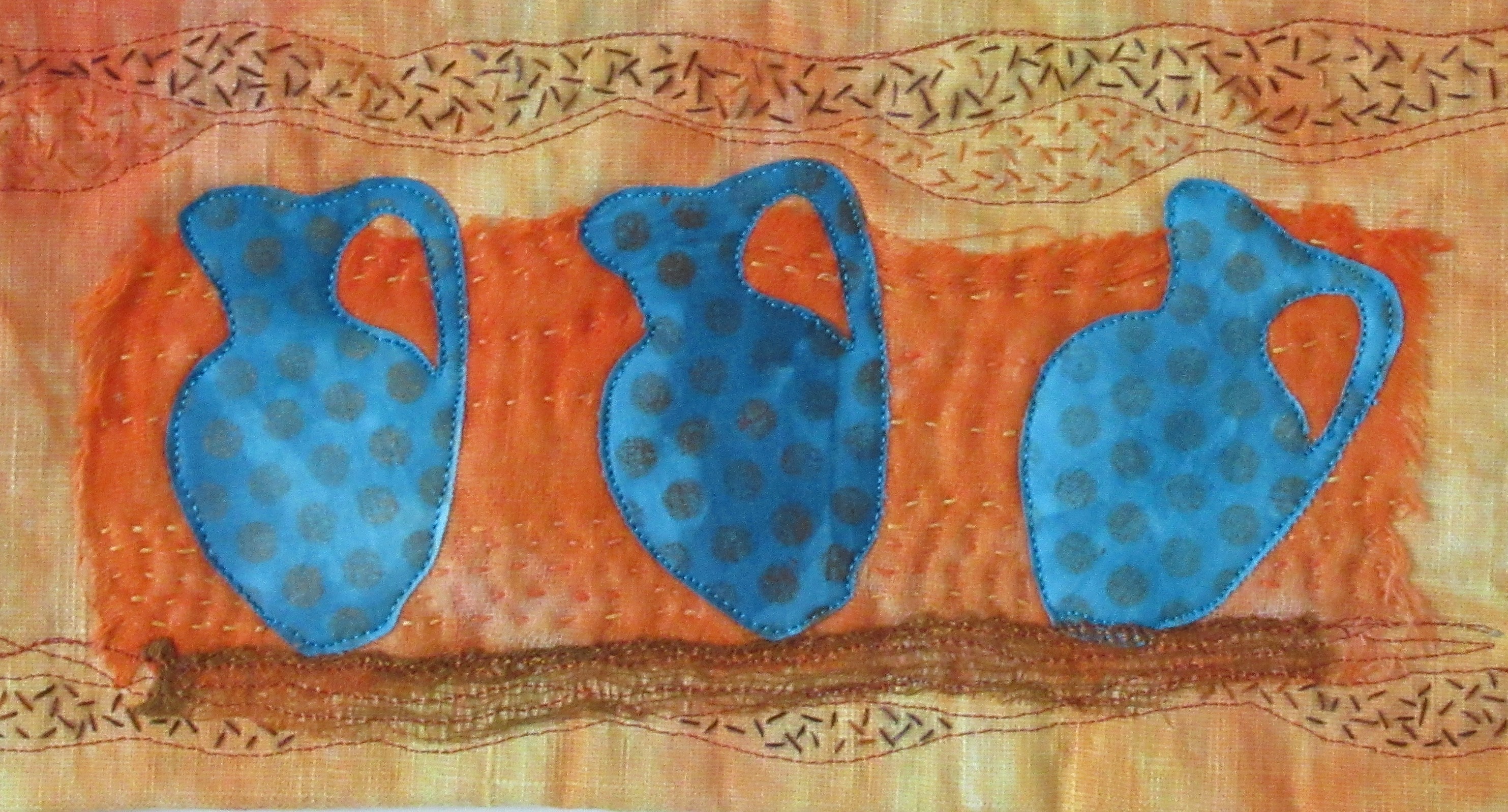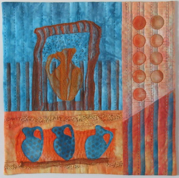 Beautiful interpretation of this wonderful pots. I love those colors and the touch of hand quilting compliments the ancient pots. Beautiful.