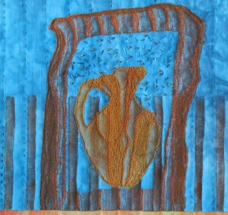 I really wanted to have a strong link between the three quilts of the series. Firstly to keep an abstract style for the background, then to work on a more figurative way for the pottery.