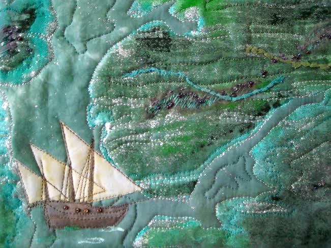 The quilt is free motion quilted, and embellished with felted wool, beads and embroideries to give texture. I’ve chosen to face it to have a larger view and avoid the cut of the binding. The boat is appliquéd.