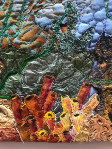 I painted some small sponges, added some painted Tyvek , lutrador and empty silk cocoons.  The sea is covered, as in all my other pieces, with blue organza en some shimmering open woven sheer fabric.