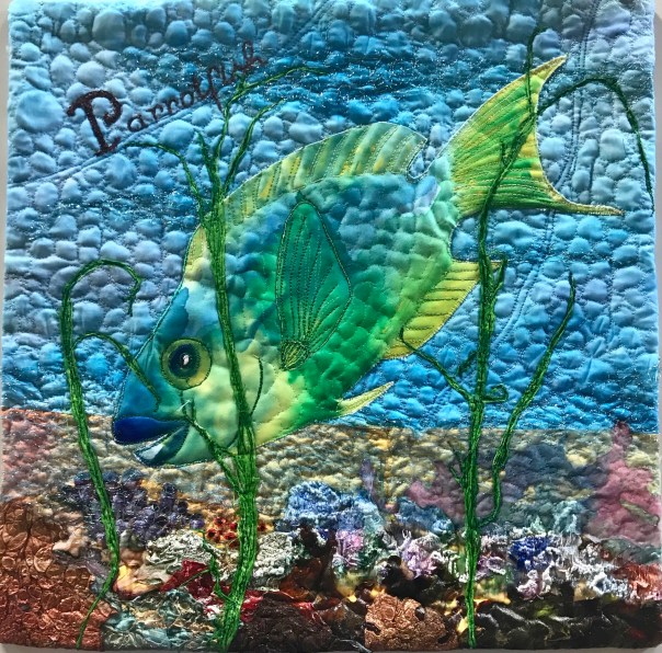 The parrotfish is painted on silk, ironed with “wonder under” on a piece of white cotton, cut out and machine appliqued on the background. Fins and scales are “thread painted” with polyester and monofilament thread.