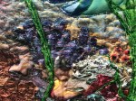 The whole piece is free motion quilted with polyester thread and some hand painted green tree bark pieces are added for plants. Finally the letter P from Parrot fish is cut from tyvek and appliqued. The rest of the word is embroidered by machine. The piece is finished with a facing.