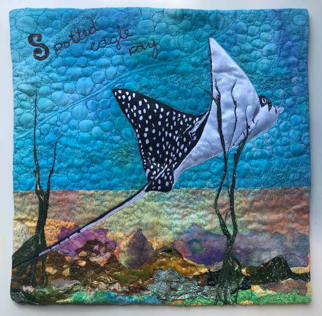 The background for the sea is made of a piece of ice-dyed fabric and the ocean bottom is hand painted fabric. The spotted eagle ray I painted with acrylic paint on satin and appliqued on the background. Coral is made from scraps of tyvek, lutrador with puff-paint, transfer painted lutrador and skins made with pouring medium and fluid acrylic paint. The sea is covered with blue organza and pieces of open woven silver blue synthetic fabric. This material has also been used to cover the coral at the bottom of the sea. To create a little more depth I added some green painted tree bark plants