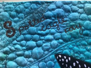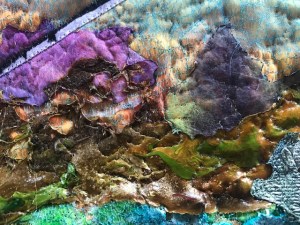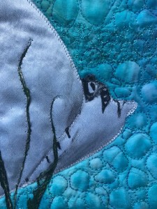The background for the sea is made of a piece of ice-dyed fabric and the ocean bottom is hand painted fabric. The spotted eagle ray I painted with acrylic paint on satin and appliqued on the background. Coral is made from scraps of tyvek, lutrador with puff-paint, transfer painted lutrador and skins made with pouring medium and fluid acrylic paint. The sea is covered with blue organza and pieces of open woven silver blue synthetic fabric. This material has also been used to cover the coral at the bottom of the sea. To create a little more depth I added some green painted tree bark plants