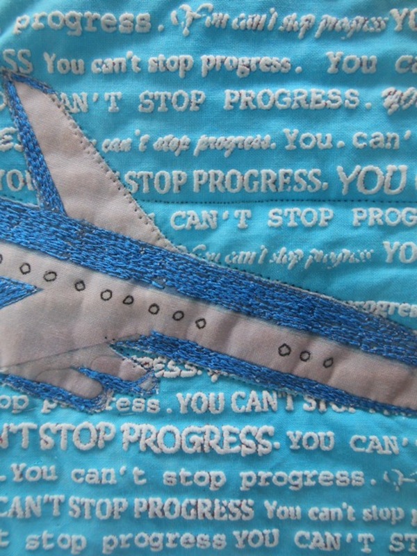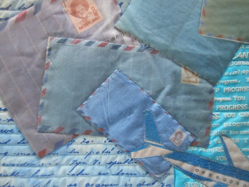 The airplane is a photo from an old airmail paper cover, printed on fabric and threadsketched on the machine.
