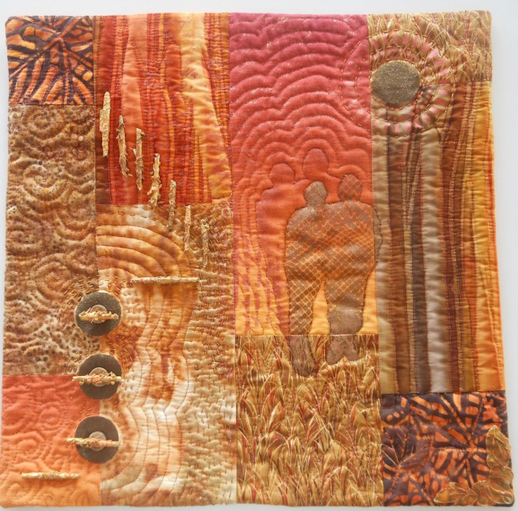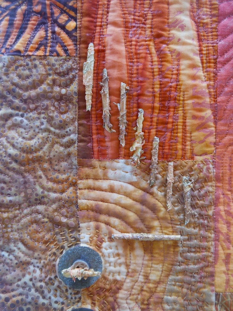 Material: handdyed and rusted fabric. Commercial fabric. Gold lamé. Tyvek, Shiva paintsticks and freezerpaper. Metallic and handdyed thread.