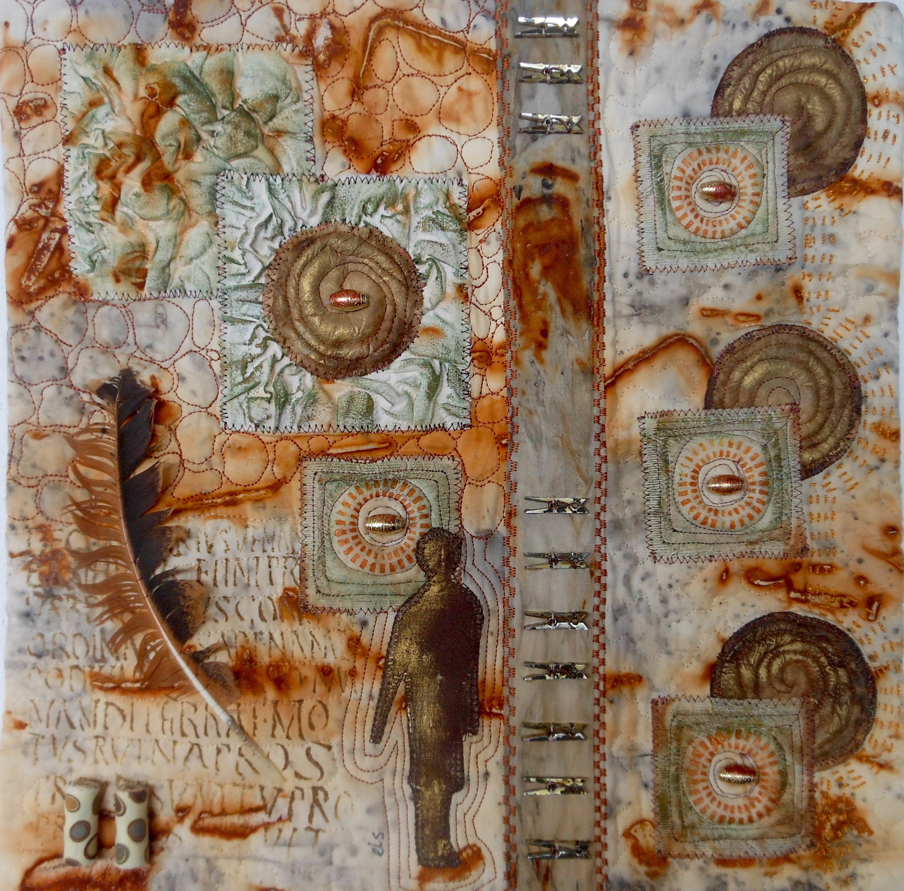 Material: Rusted fabric, dried teabags and coffee-pads, metallic gold fabric paint, metallic gold thread, variegated cotton thread, acrylic gel medium, gilders paste gold, paintstick gold, feather, fabric beads, very small rusted clothpins, beads.