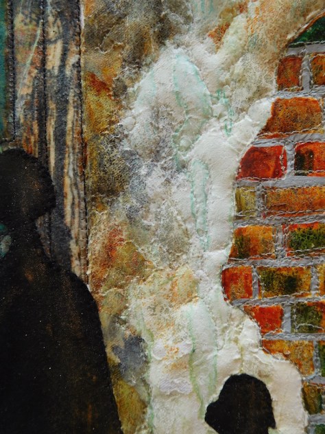 I then painted a wet piece of fusible web (wonder under) with Golden fluid acrylics and after drying ironed it on the cotton. On top of this I painted bricks that emerged after the crumbling of the stucco. Also the mildew stains on the wall were painted with the fluid acrylics.