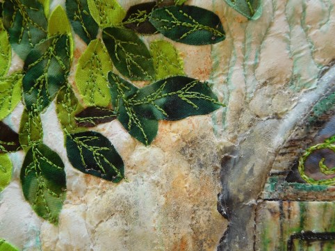 The pavement is made from batik fabric and a little colored with iridescent green and cream paint stick.