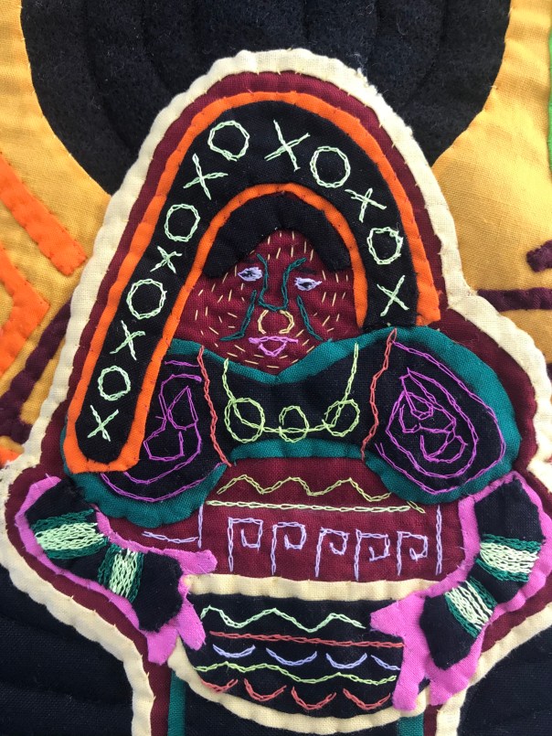 Since it is a very matriarchal society I  choose a Guna lady as icon. I copied it from a mola that is in my possession, appliqued several layers and embroidered it just in the way they do with a very fine chain stitch and thin sewing thread. I even embroidered their “wini” bracelets , necklace and nose-ring.