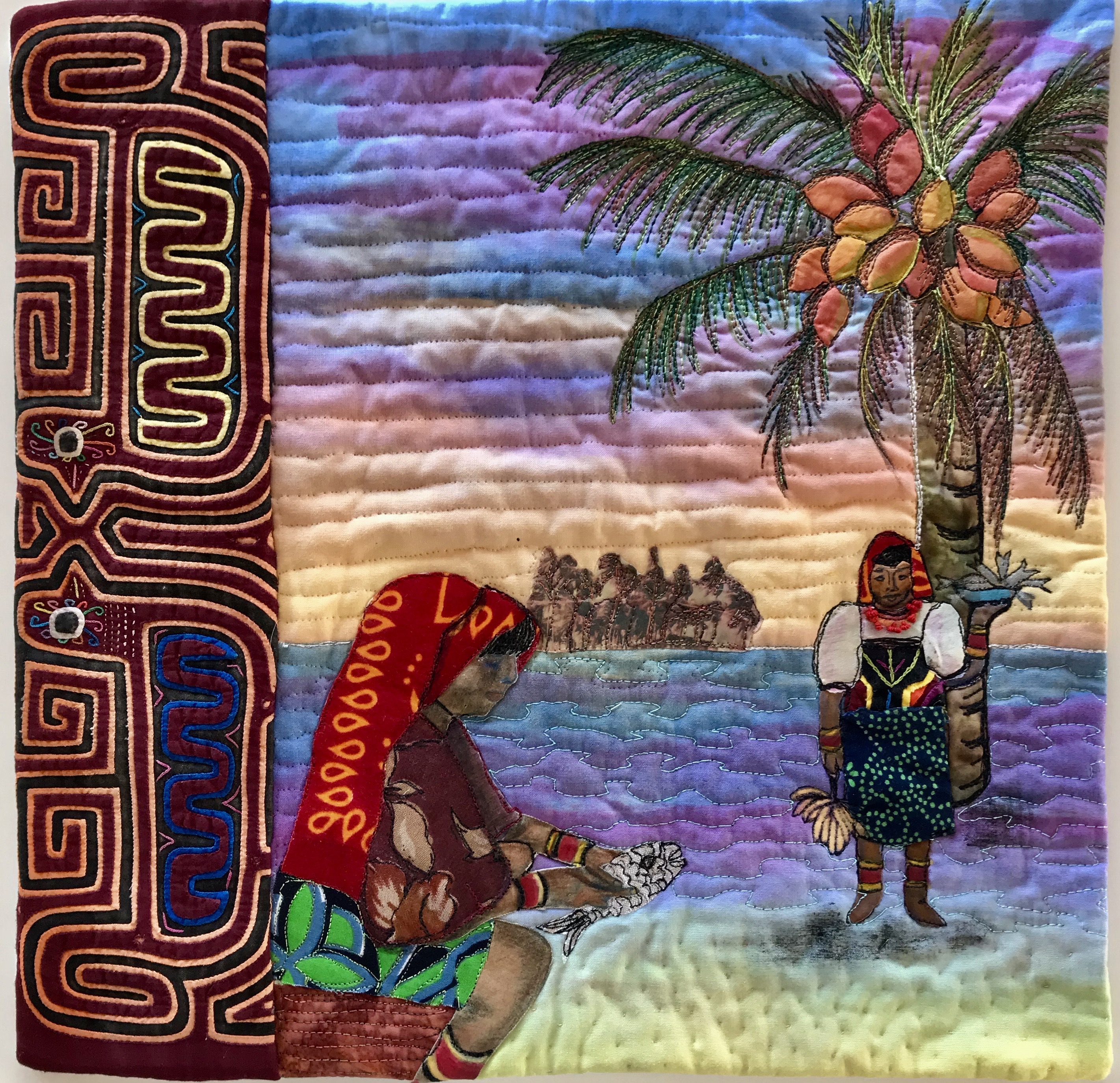 The painted background adds such realism to your quilt, and I love how you have incorporated small sections of your mola as clothing for the women. Stunning as usual!