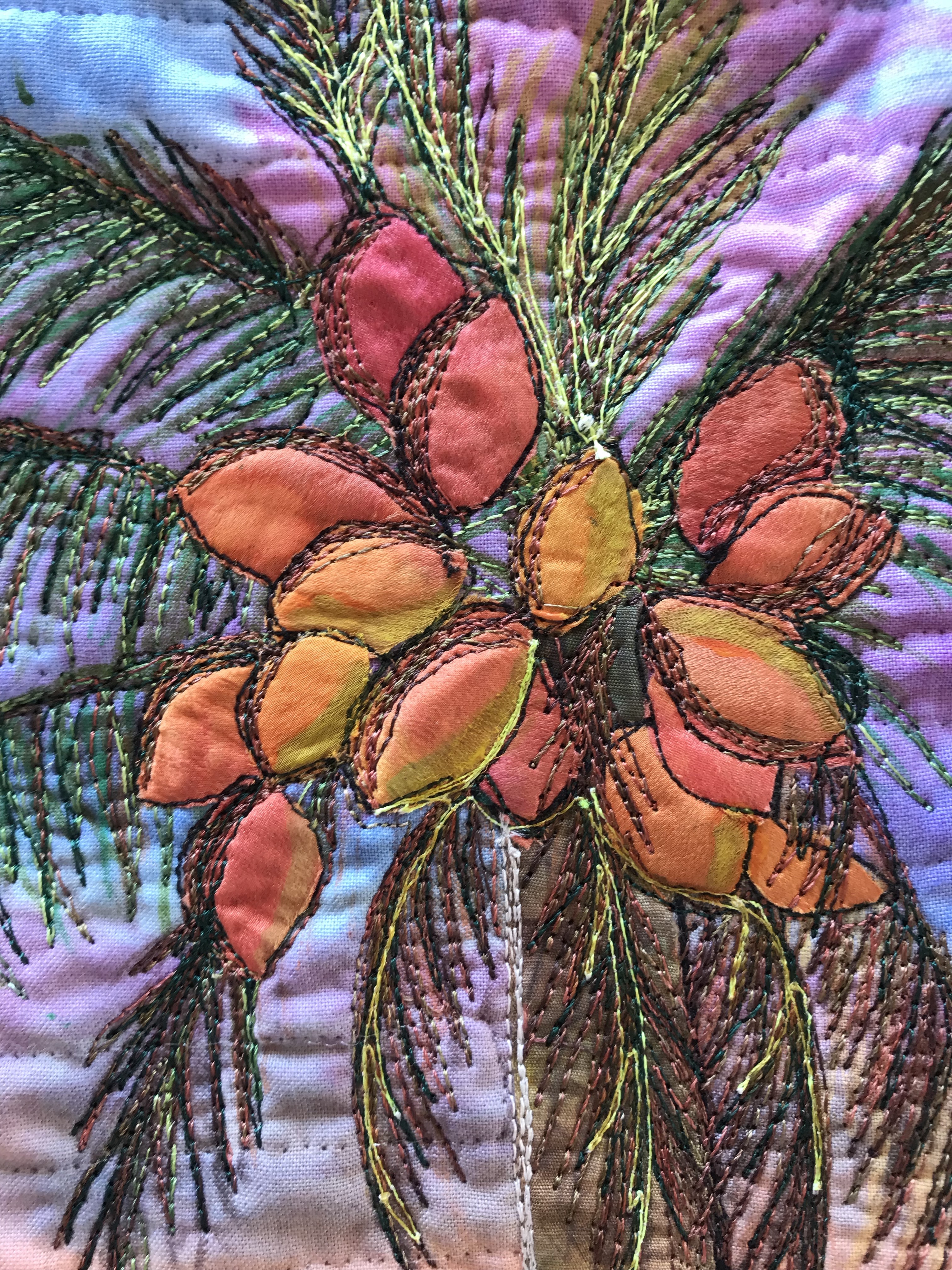 I appliqued the tree trunk and the coconuts on a hand painted background. The palm leaves are first painted with an acrylic pen and later thread painted by machine. The island in the distance, with all the palm trees is a phototransfer with gel medium on organza.