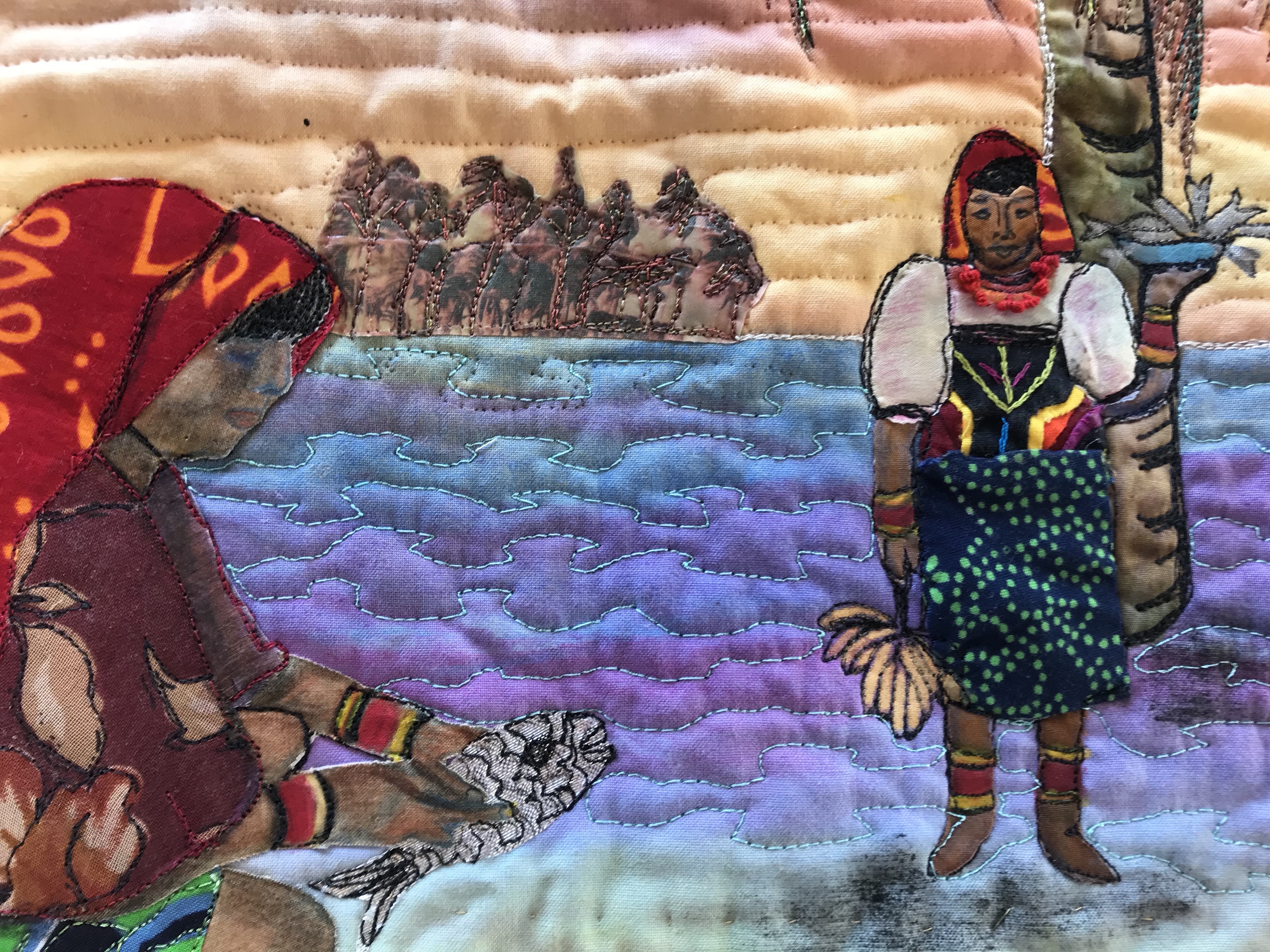 The lady who cleans the silver fish is made with the paper doll technique explained in the book “Create landscape quilts” by Meri Henriques Vahl. The lady with the bunch of bananas and the bowl with fish is first drawn on water-soluble fleece and then sewed onto the background in front of the banana tree. She is wearing a part of an original mola blouse and skirts and head scarfs of both ladies are pieces of original clothing of the Indians also.