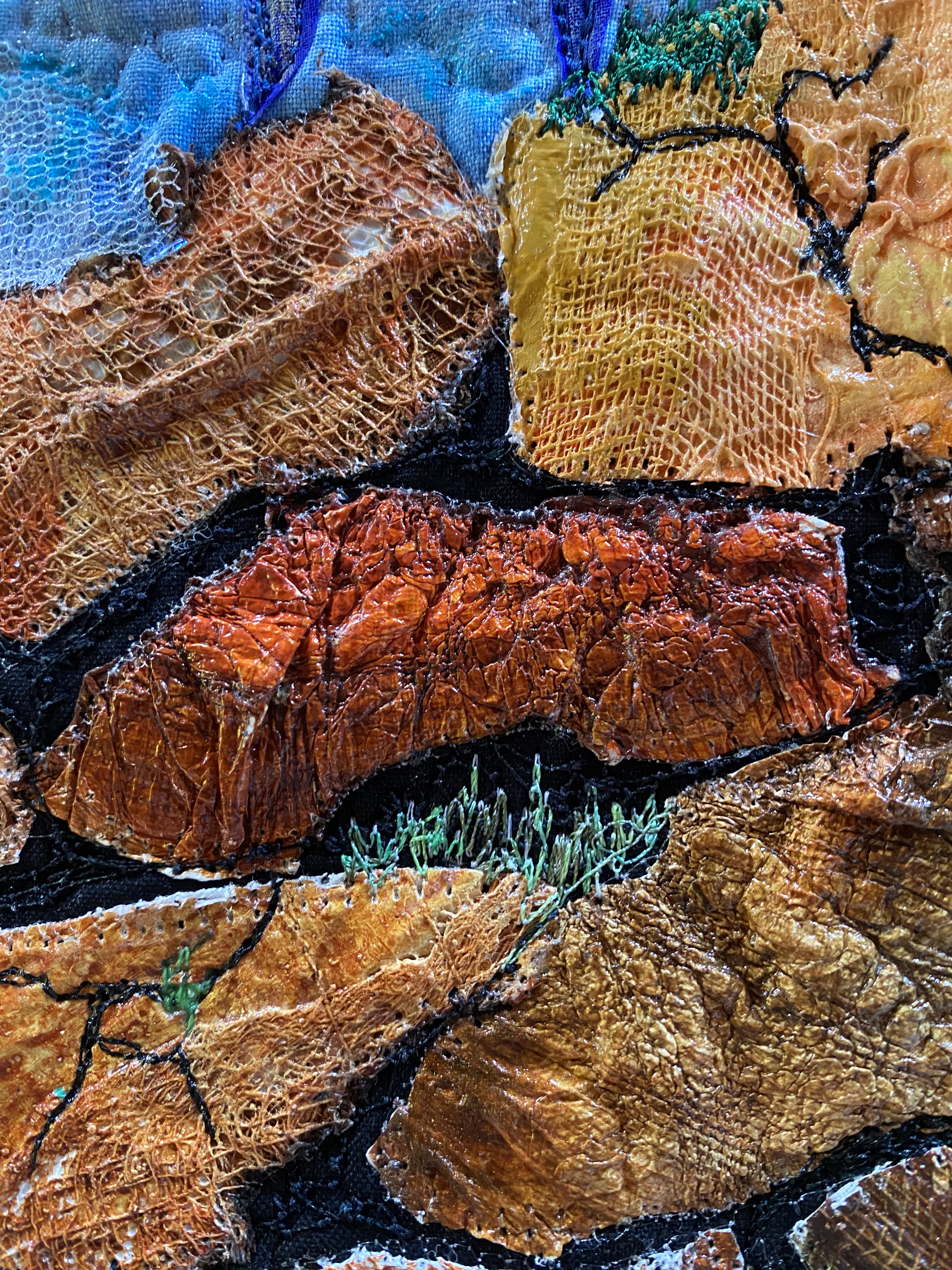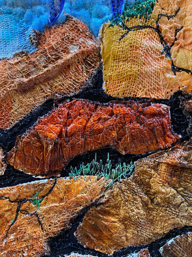 Your painted fabric for the sky is gorgeous ! I love the different layers and texture on the rocks !