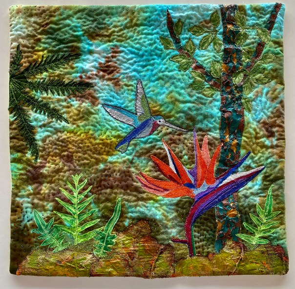 10. The perfect match to your first rainforest piece. The same brilliant colors, the same tree, the many different techniques. Lovely hummingbird and awesome bird of paradise flower. Great stitching as always. Stunning piece.