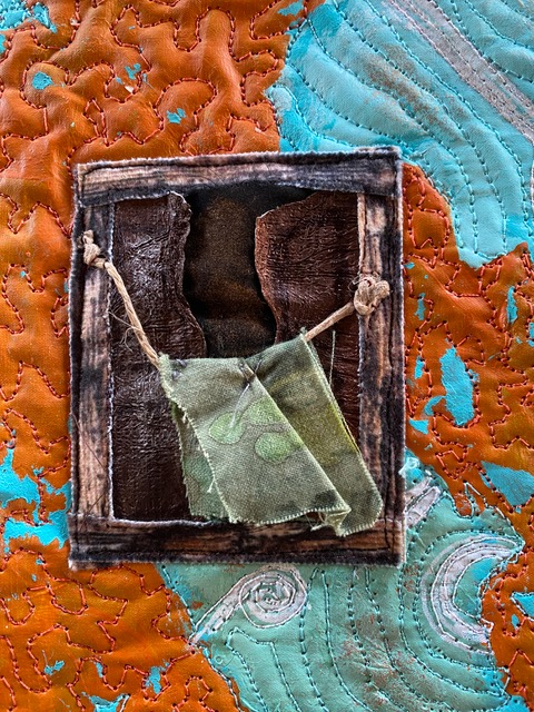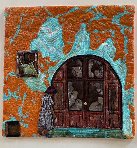The door is stitched, painted and finally burned with a soldering iron. The broken glass is silver fabric with a double layer of tulle over it. A small window is added with tyvek shutters and an old piece of cloth (decay) hanging 3D out of the window.