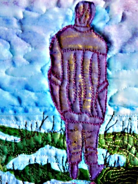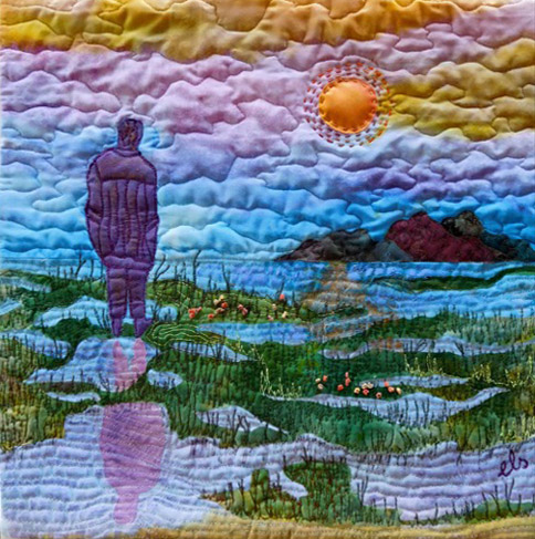 I traced the silhouette and fused it on a hand painted piece of fabric. I had doubled the fabric while painting, so the reflection of the sky is in the water below. I placed some organza on top of the water. A hand dyed lighter version of my silhouette is reflecting in the water. The land I am standing on is green hand dyed silk.