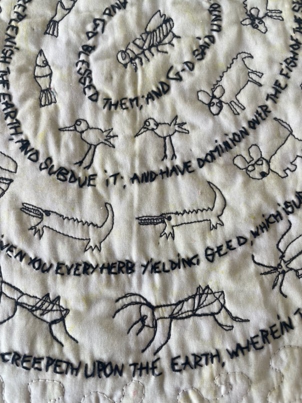 Day six was a busy day. All the animals came into being “…He made the beasts of the earth .. the cattle .. and everything that creepeth on the ground”. And the ultimate of the creation: “… created man in His own image … male and female created He them”. In my quilt I have hand stitched verses describing the sixth day in a circular fashion echoing our round globe, depicted different animals in twosomes – male and female – as well as a male and female figure. The blooms in the corners are there to remind us of how beautiful this world is and the animals remind us of the upcoming story of Noah and his ark of animals, male and female.