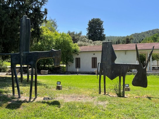 The quilt shows two bronze sculptures representing Don Quichote and his helper Sancha Panza by Israeli sculptor Dan Zaretsky (1938- ) located in front of the Wilfrid Israel Museum at Kibbutz HaZore’a. The name of the kibbutz founded in 1936 translates to “the sower”, chosen to symbolize the members’ connection to the land.