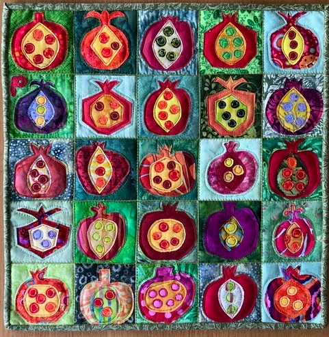 Pomegranates are my favorite fruit. When in season they are in abundant supply here and we eat them every day. For this subject I adopted the technique developed by Gillian Travis called Interchange Applique and worked with two fabrics for each 3” block. Saved some fabric as 3 are recommended per block! The result is a positive and negative quilt, the first one having a green background with red fruit and the second one a red background with green fruit.