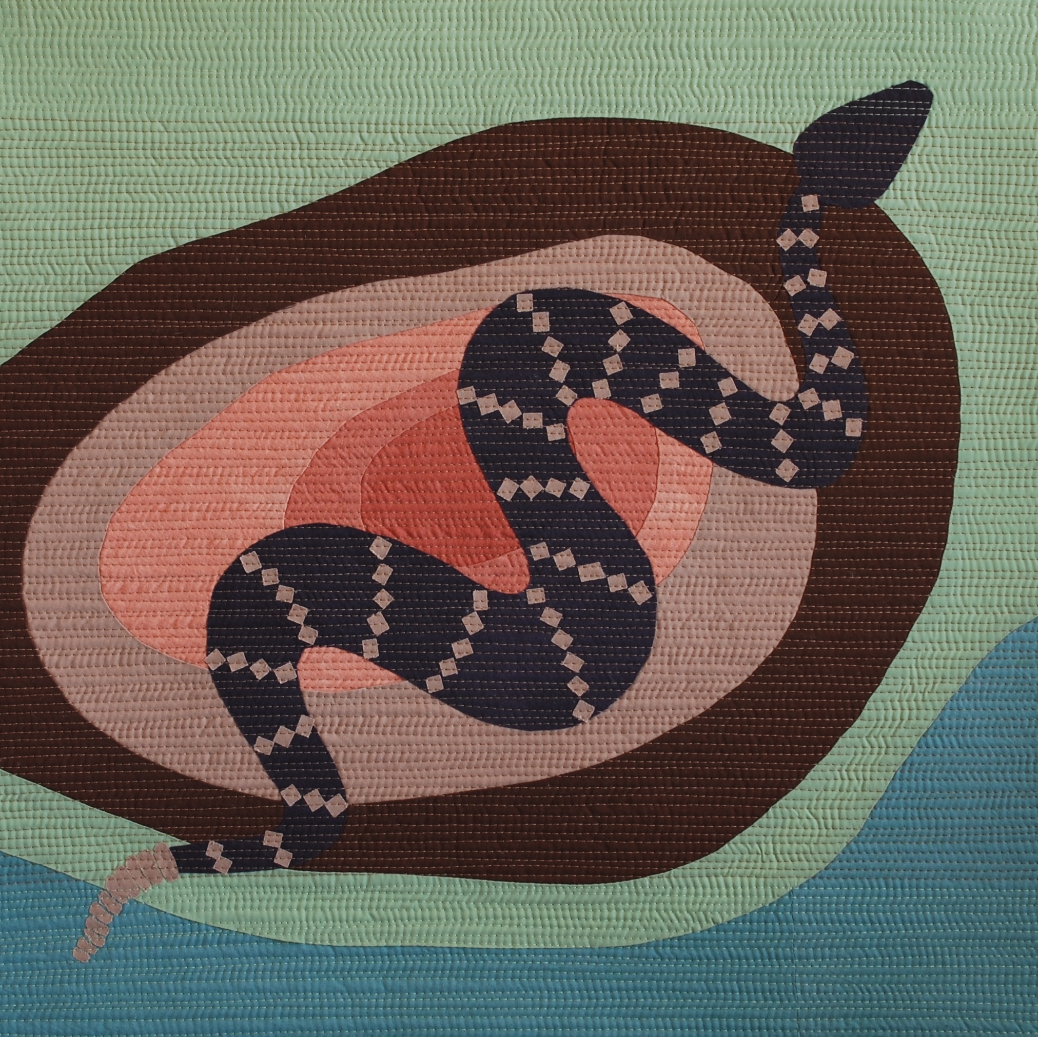 Materials and technique: cotton fabrics (commercial and hand dyed), cotton batting, poly thread. machine pieced background, raw edge applique rattlesnake, machine quilted.