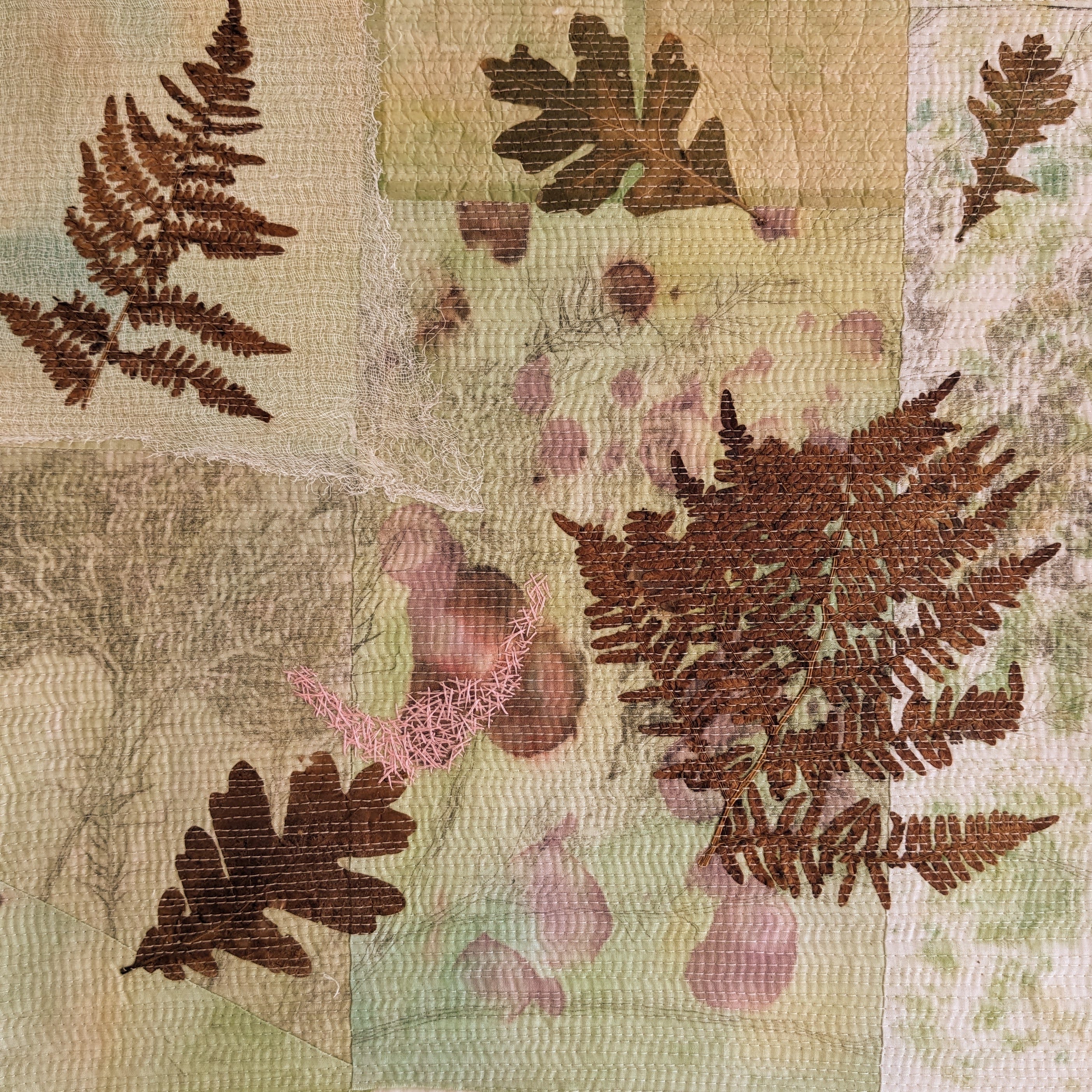 Materials and technique: repurposed cotton fabrics, tea bags, real leaves preserved, printmaking ink, watercolours, inks, cotton batting, poly thread, embroidery floss, cheese cloth. Dry point printmaking, preserving of leaves, machine pieced, machine quilted, hand embroidered.