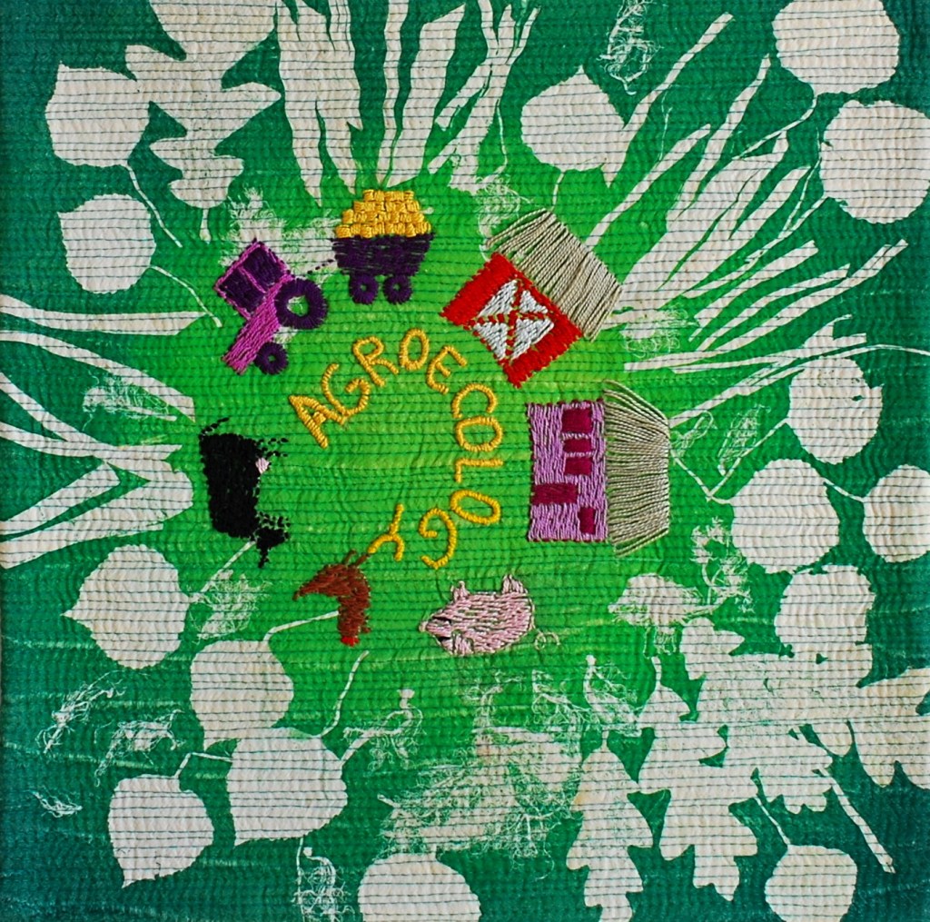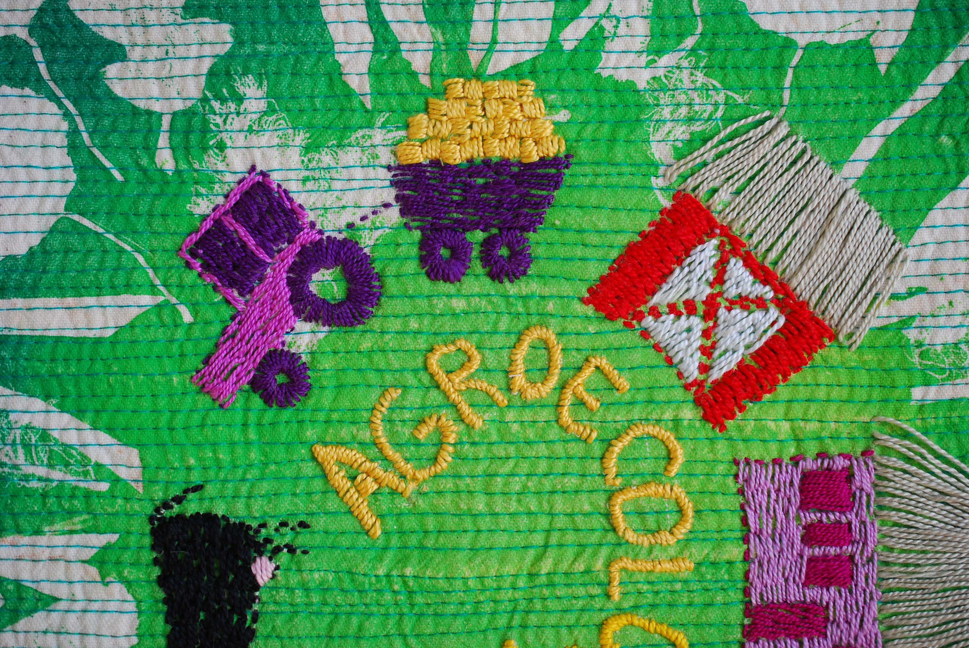 Green is the colour of hope, you have chosen the right colour to represent your message. The strong chromatic contrast paired with the monoprint is magnificent. The combination with the hand embroidery is harmonious and gives a captivating result. A great job that completes your series perfectly. I love it! Compliments!