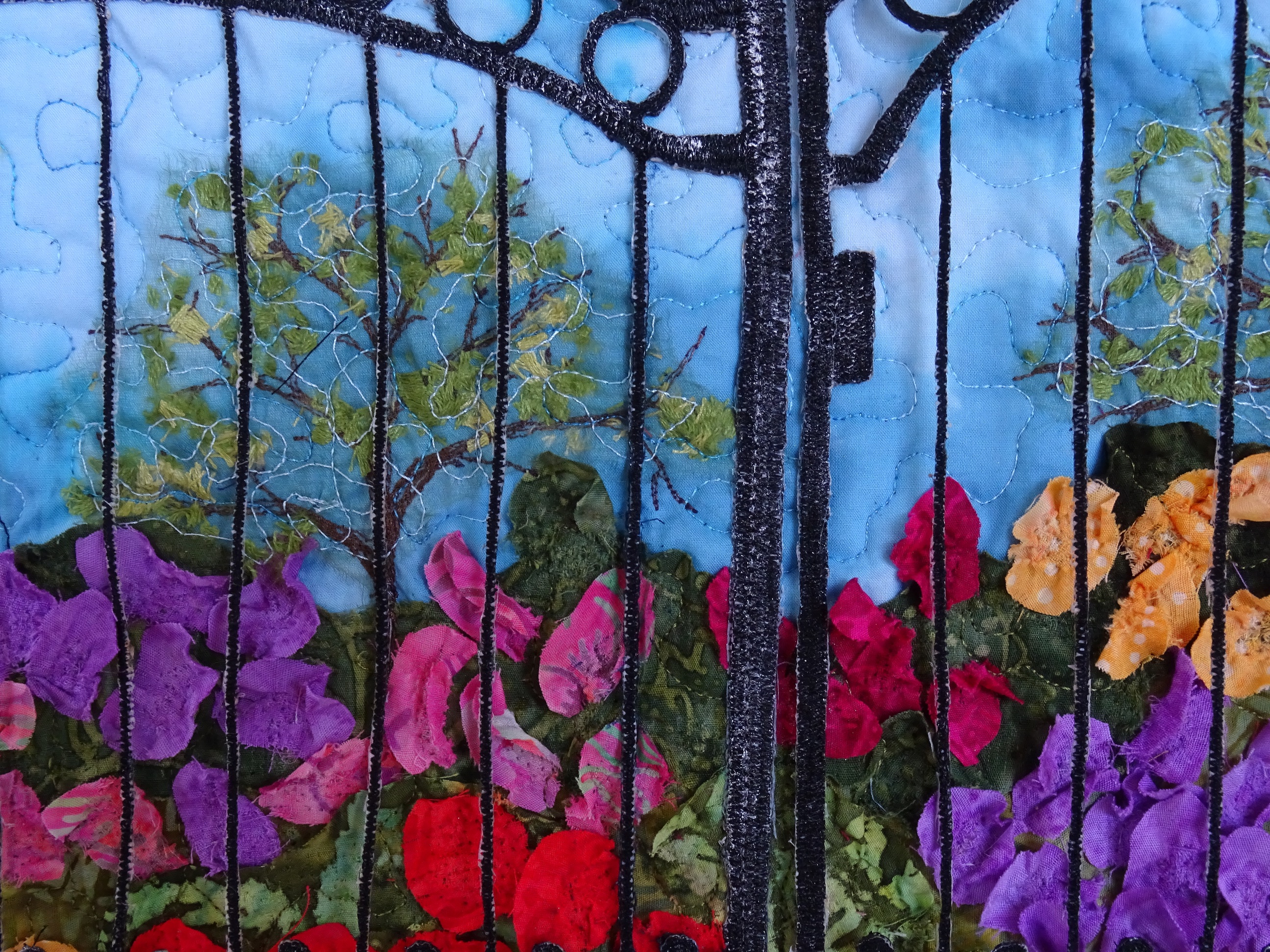What a colourful interpretation of our theme. The lovely flowers and the wrought iron fence are very eye catching. This piece must have been very time consuming, but well worth it for such a great result.