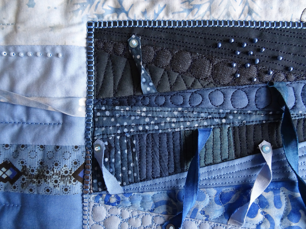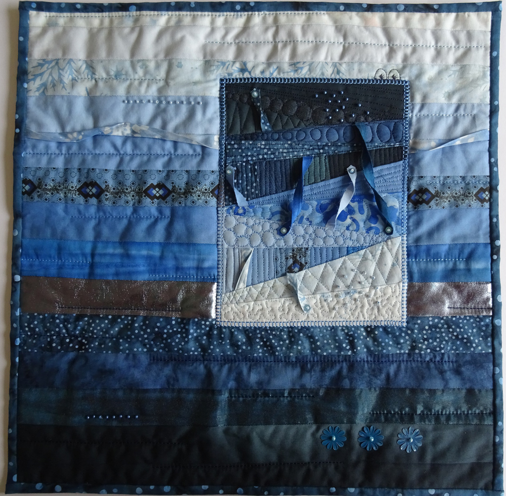 9. Well if this is the result of chaos in your head it was well worth it. Great contrast withf the straight piecing in the background and the use of angles for the smaller piece. I love all the blues and the lovely machine quilting certainly adds magic to the piece. Welcome to our group.