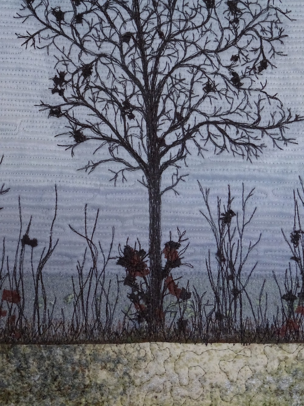 Very captivating quilt! I love your drawing of trees. Adding the frozen bushes and the organza completes this misty and frosty landscape very well. Lovely work. Bravo!